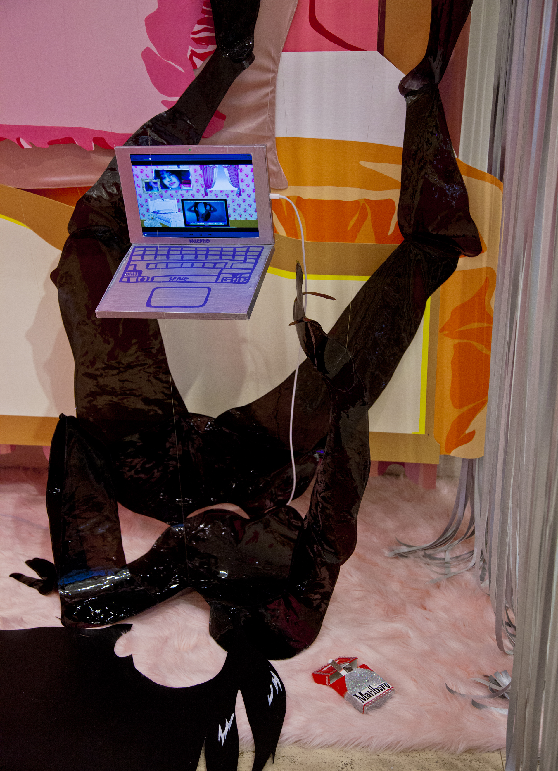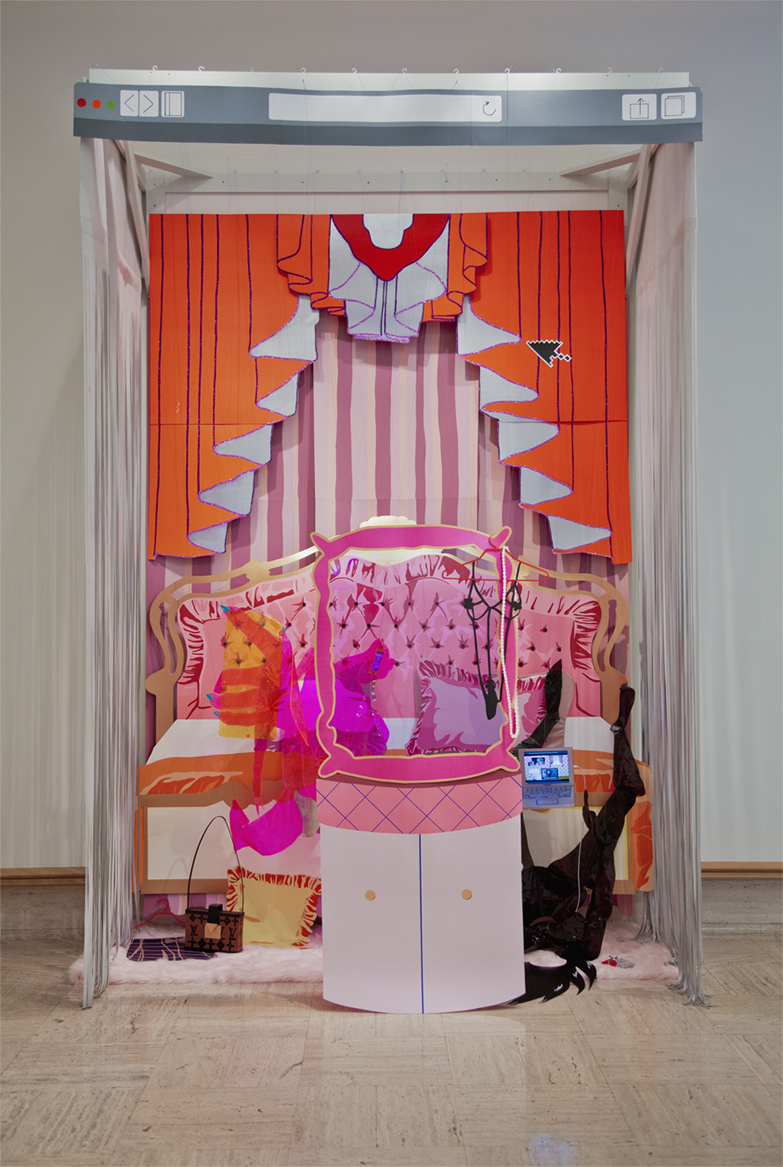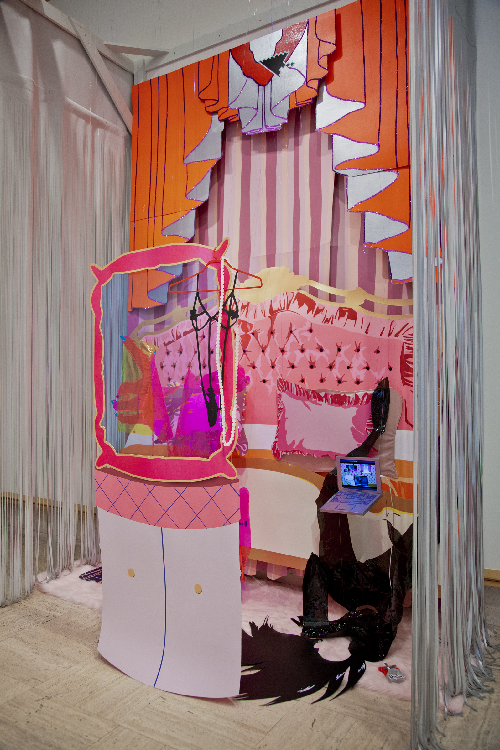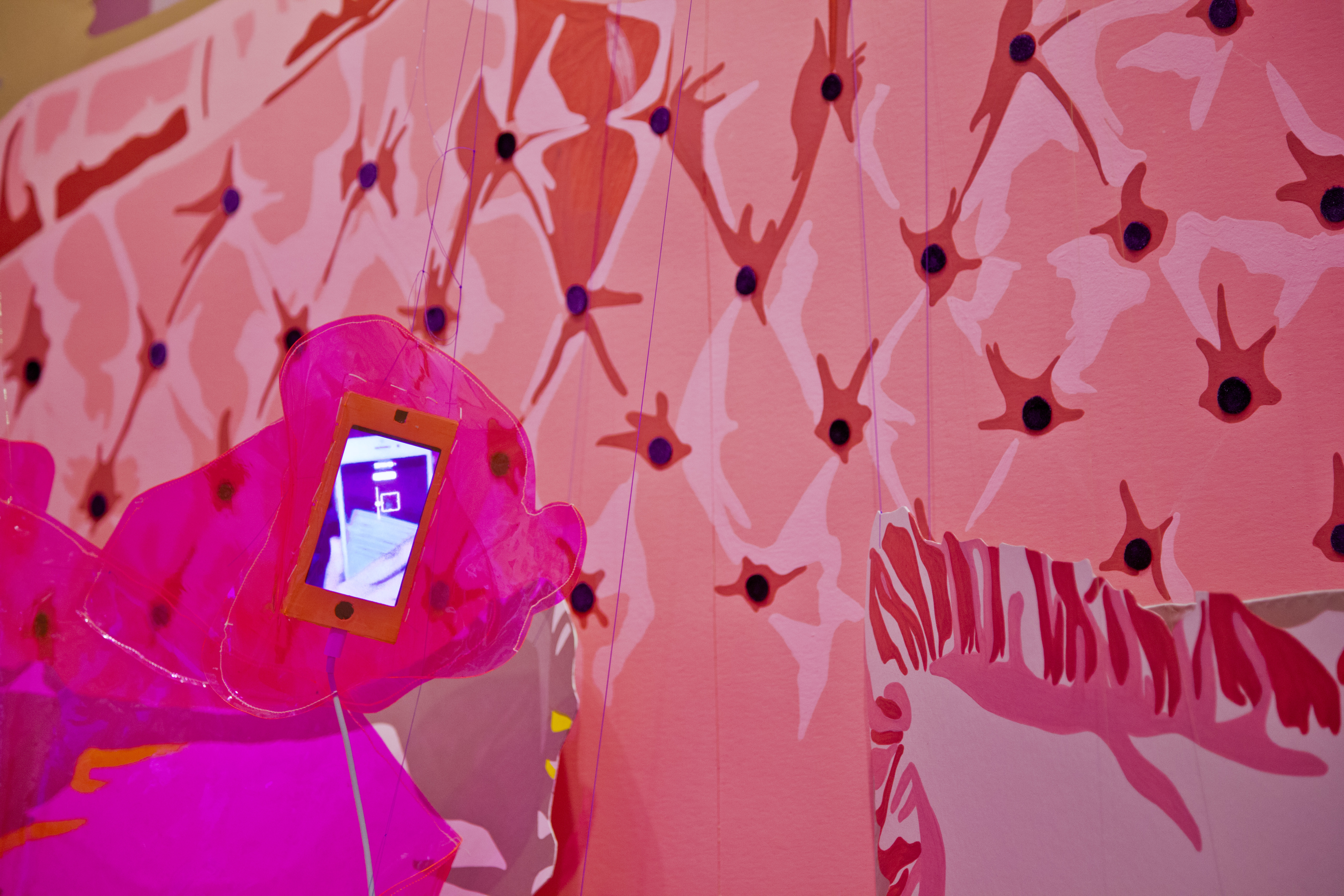 Cardboard, acrylic paint, glitter, vinyl, acrylic sheet, fabric, velour, faux fur, iPad, and iPhone.