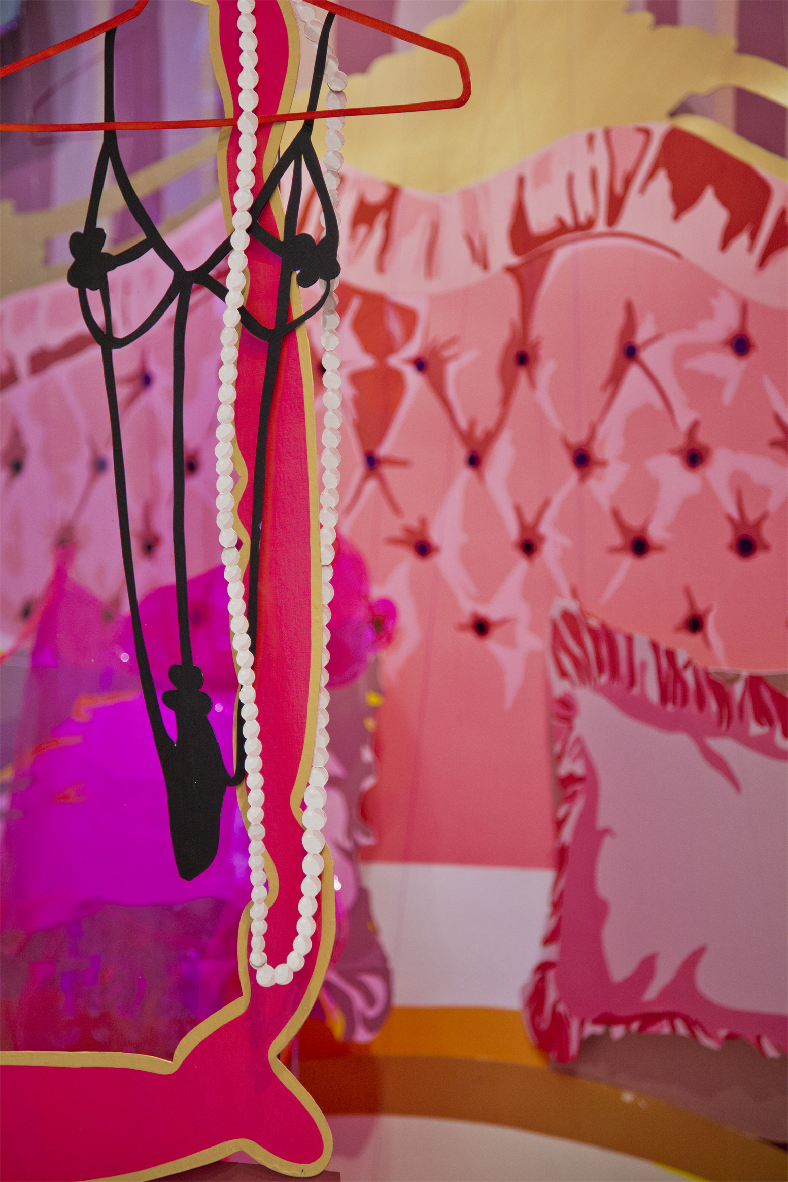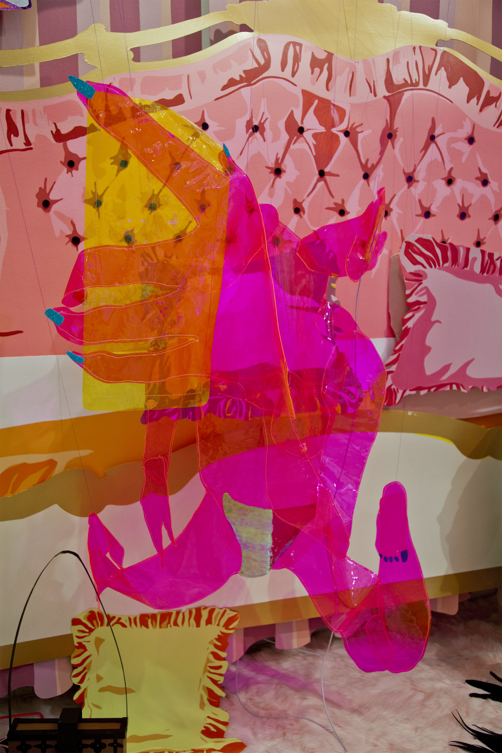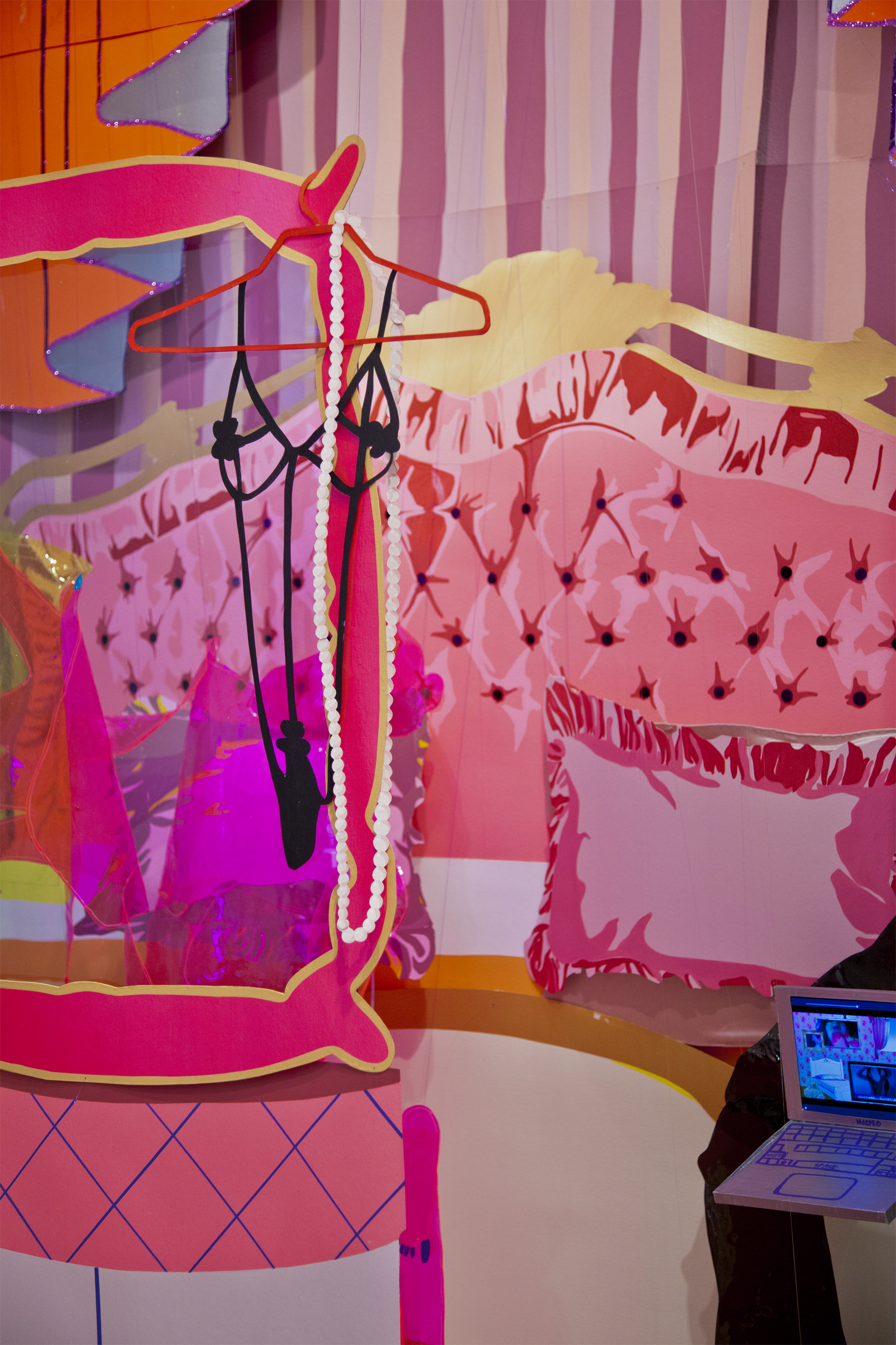 Cardboard, acrylic paint, glitter, vinyl, acrylic sheet, fabric, velour, faux fur, iPad, and iPhone.