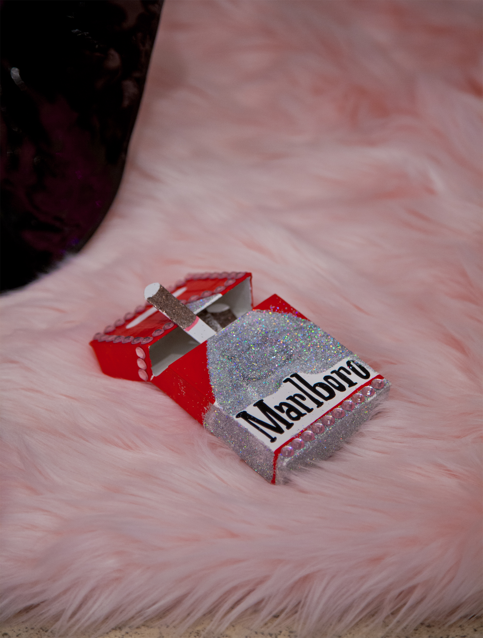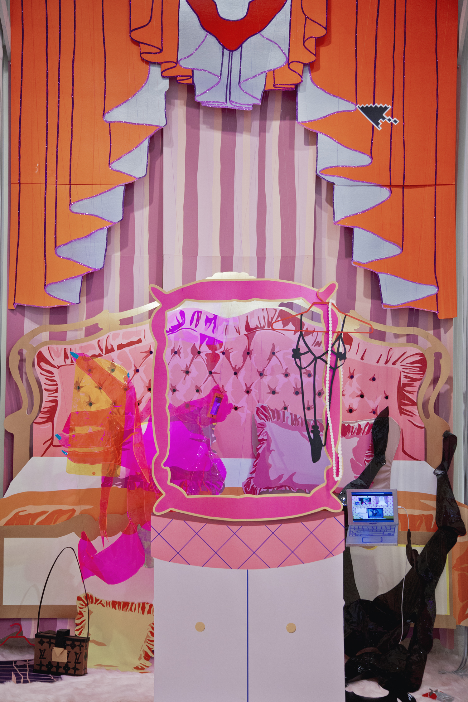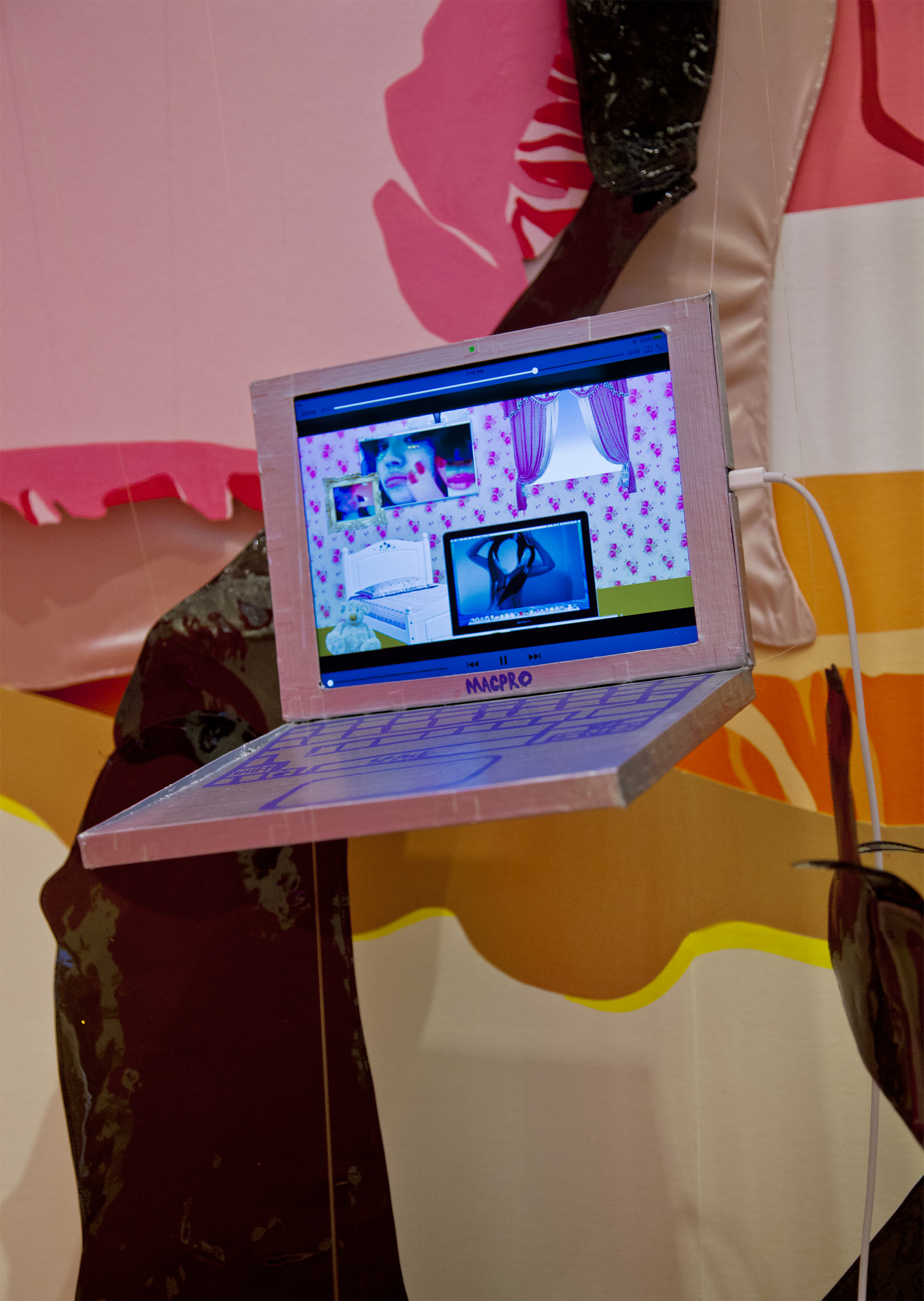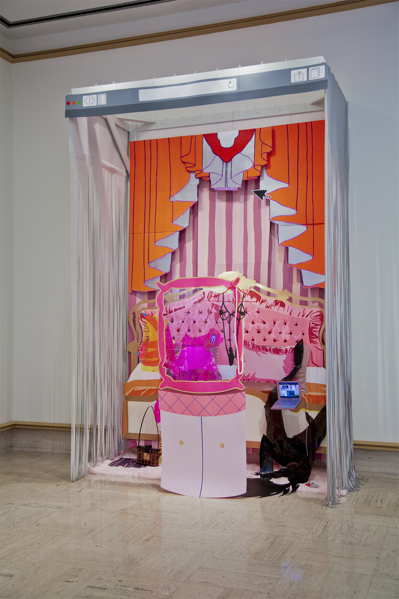 Cardboard, acrylic paint, glitter, vinyl, acrylic sheet, fabric, velour, faux fur, iPad, and iPhone.